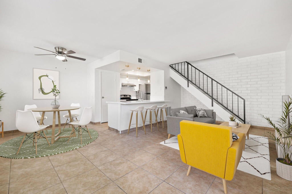 Welcome to Indian Creek Villas - perfectly located just minutes from El Paseo's world-class shopping and dining, College of the Desert, The Living Desert Zoo & Gardens, McCallum Theatre, and scenic hiking trails right outside your door. This charming two-story condo offers an open-concept living area with a stylish brick accent wall, creating a warm and inviting space. Upstairs, you'll find two spacious bedrooms with newly installed flooring. The interior has been freshly painted and features a beautifully updated kitchen with new appliances, quartz countertops, and modern pendant lighting. The bathroom has been upgraded with a re-tiled shower tub and new vanity, plus two downstairs windows have been recently replaced. Enjoy low HOA dues that cover water, trash, earthquake insurance, exterior paint, roof maintenance, landscaping, and access to two pools and a spa. Easy freeway access makes day trips to Idyllwild or San Diego a breeze. Move-in ready and ideally located -- this is desert living at its best!