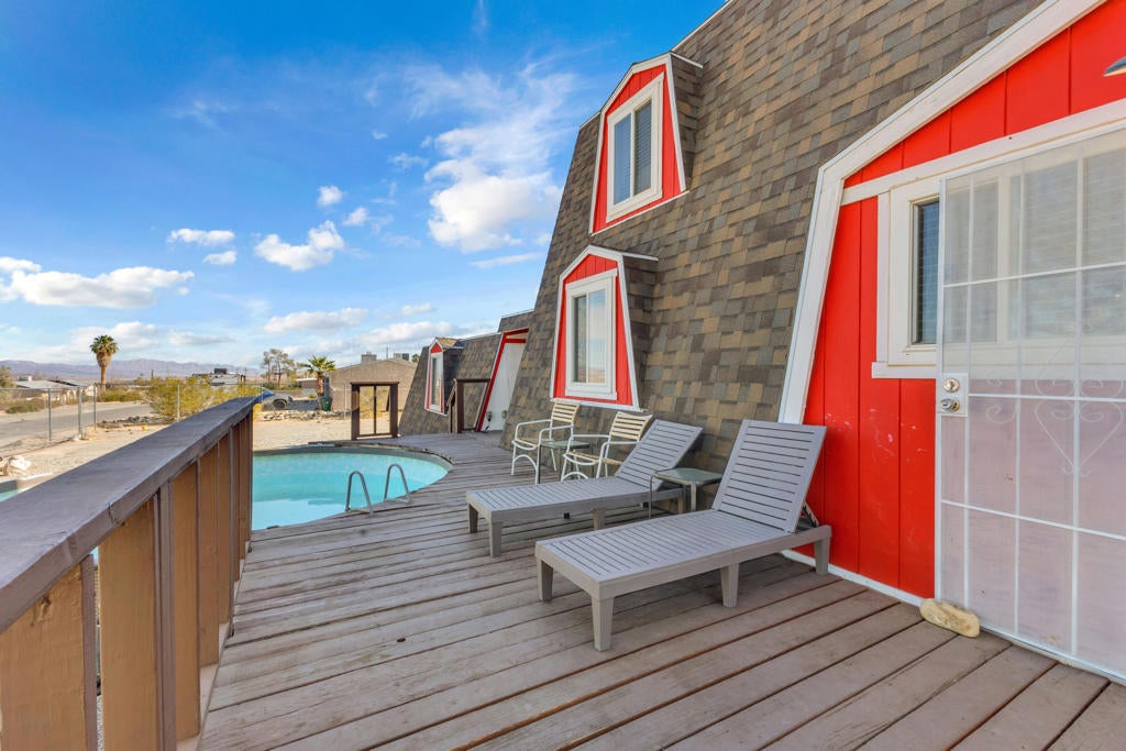 Adorable 2 story TurnKey Gambrel-Style Home in Twentynine Palms! Located on a corner lot!This one-of-a-kind 3-bedroom, 2-bathroom gambrel home is full of charm and character! Painted a delightful red with white trim, it features open beam ceilings and laminate wood flooring, creating a cozy yet spacious atmosphere.This home offers natural gas for heating and cooking, central heat and AC, and added mini-splits for year-round comfort. Situated on a corner lot, the property is fully fenced and includes a 2-car garage. The above-ground pool and hot tub provide the perfect spots to relax under the stunning high desert stars.Located just north of the Marine Base, this home boasts breathtaking sunset views to the west and is only a short 15-minute drive to Joshua Tree National Park--perfect for hiking, exploring, and soaking up the beauty of the desert.Don't miss this unique and charming property that's ideal as a full-time residence or a peaceful getaway. Currently a part time short term rental this home has so much potential! Schedule your tour today!