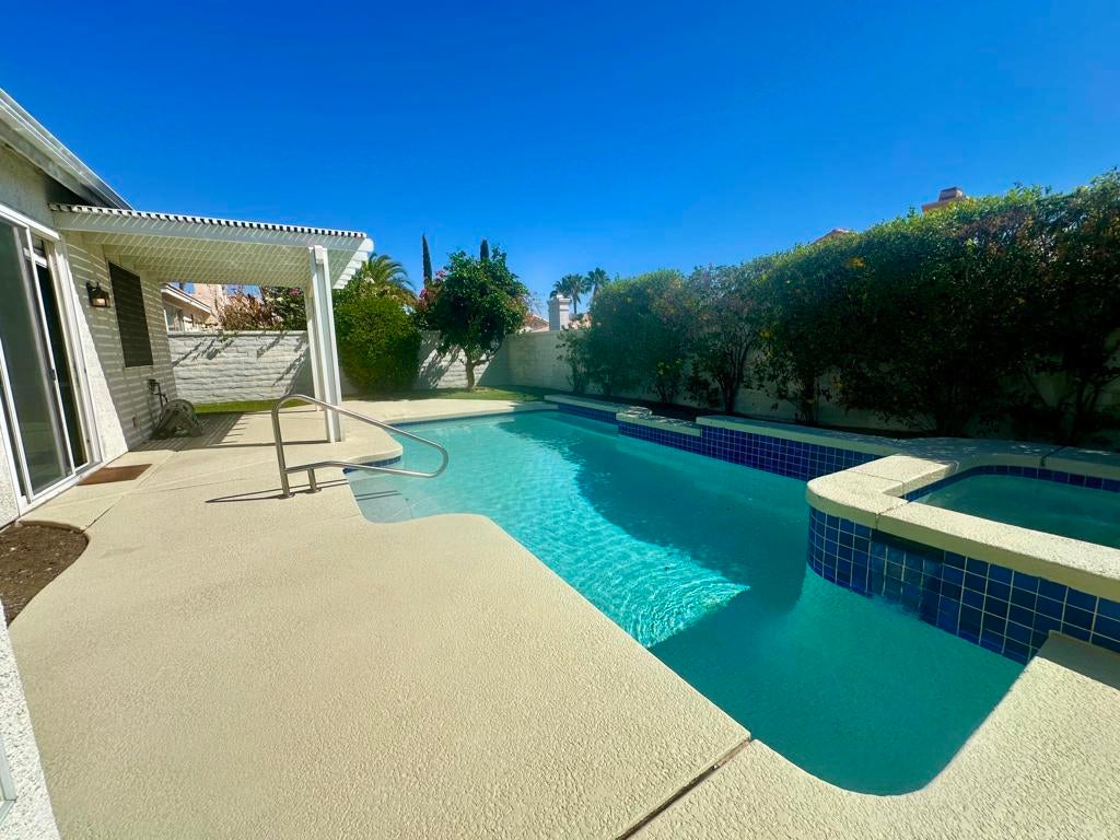 POOL Home - Spacious Open Concept with Vaulted Ceilings! This beautifully maintained detached residence is set on a north-facing lot with picturesque mountain views enjoyed from the poolside, kitchen, and family room. Located behind the gates of the highly desirable Merano community in central Palm Desert, this home offers both convenience and comfort in one of the desert's most PRIME locations. The lease is offered for a minimum of one year and includes gardening, pool service, and fix utilities costs, providing exceptional value and saving tenants thousands annually. Inside, the home showcases an open-concept floor plan with soaring ceilings, a dramatic double-sided fireplace, kitchen island, custom blinds, and expansive windows and glass sliders that flood the home with natural light while creating seamless indoor-outdoor living to the pool area. Flooring is upgraded luxury vinyl plank and tile throughout, and interior wall colors may be refreshed to all white at tenant's request for a lighter, more contemporary feel. This versatile floor plan features three bedrooms plus a den, with the den offering custom built-ins and dual access points from both the living room and hallway. The primary suite is a private retreat with corner windows, direct slider access to the covered patio and backyard, a walk-in closet, and a private bath complete with dual sinks and step-in shower. The two guest bedrooms are served by a full hall bath, with one bedroom offering direct access for added convenience. An indoor laundry room with sink and generous cupboard storage adds everyday practicality. The private backyard is designed for relaxation and entertaining alike, boasting a sparkling pool, raised spa, two covered patio areas, and ample decking for soaking up the sun. Low-maintenance desert landscaping in the front and back enhances curb appeal and ease of care. Additional highlights include a private two-car garage with direct access, two storage sheds, and mature landscaping. Merano is an intimate gated enclave of just 126 homes, prized for its central Palm Desert location. Across the street you'll find everyday conveniences like groceries, coffee, and dining, while a short drive connects you to Eisenhower Health Campus, major retailers to the north, and the luxury shopping and dining of El Paseo to the south. For entertainment, Palm Springs is just 10 miles away, including Palm Springs International Airport for easy travel access.