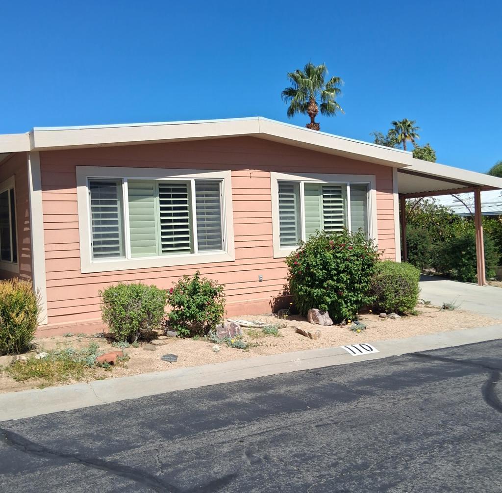A beautiful location, with vast views of the western Coachella Valley. The off shoot from the master bedroom is a 400 square foot back patio, with no obstructions of the view, and a perfect place to do outside entertaining. This is a deal, and a must buy; considering the price point on even outdated homes in this mobile home park. Granite countertops from the same stone quarry are through out the home. Modern fixtures are included like a Bosche Dishwasher and stackable washer and dryer.
