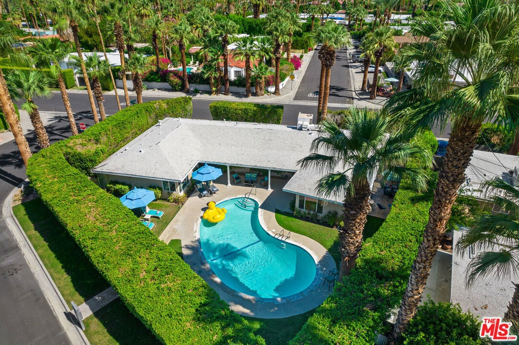 Gated and secluded, Classic Mid-Century 4-unit compound featuring a kidney-shaped pool with unobstructed views of the San Jacinto Mountains from the common area. Lush landscaping surrounds a bright 2-bedroom, 1-bath potential owner's unit with a galley kitchen, marble countertops, and stainless-steel appliances. Three additional studio units each with 1 bath, compact galley kitchens, and ample closet space. All units have individual HVAC, travertine floors, and are separately metered for utilities. An excellent investment opportunity ideal as either a primary residence, family compound, or income producing property. Property is currently tenant occupied. Please do not disturb tenants.
