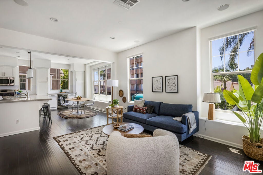 Welcome to The Gatsby Hollywood, a stunning modern development by Far West Industries, just blocks south of Sunset Blvd and moments from LA's premier dining and entertainment. Located in a quiet residential pocket, this southwest-facing END UNIT enjoys abundant natural light, creating a bright, airy feel throughout the day. The home features 2 spacious bedrooms with walk-in closets, 3 bathrooms, and a versatile Den/Office that can easily function as a 3rd bedroom or guest room. Soaring 9-foot ceilings throughout the home enhance the open-concept design, adding volume, light, and a true sense of space. The expansive kitchen features custom cabinetry, European quartz countertops, stainless steel appliances, and a built-in wine cooler perfect for entertaining. It flows seamlessly into the dining area and large living room, all finished with engineered hardwood floors, dual-pane windows, and recessed lighting. Enjoy panoramic views from Downtown LA to the Hollywood Hills on the sun-drenched rooftop deck, complete with turf, sun loungers, and a Bose surround sound system, including outdoor speakers. Ideal for entertaining from sunrise to sunset. Additional highlights include: GE security alarm system with Nest cameras, a Nest thermostat with integrated smoke and carbon monoxide detectors, 12 state-of-the-art solar panels for eco-conscious living, a 2-car attached garage with red-fleck epoxy flooring and custom storage cabinets. No HOA and no Mello Roos. This home truly has it all: style, comfort, sustainability, and an unbeatable location.