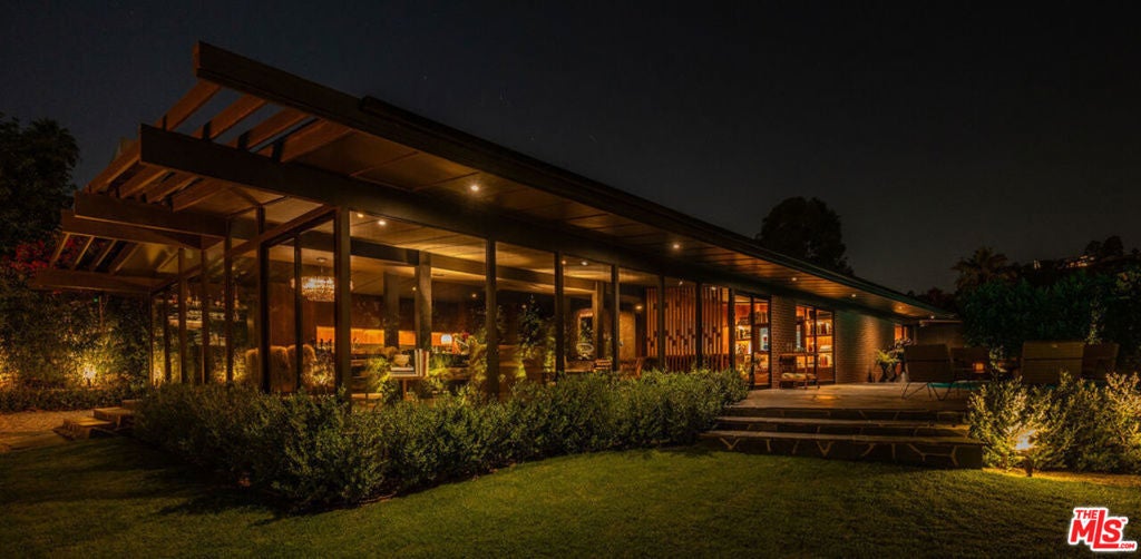 Poised within a sanctuary of architectural beauty and raw natural landscape, this mid-century masterpiece has been reborn--an expression of quiet power, precision, and timeless seduction. Every line refined. Every material intentional. Floor-to-ceiling glass dissolves boundaries between interior and exterior, framing the city skyline like a living work of art. Light moves through the space like liquid, illuminating sculpted forms and impeccable craftsmanship. A complete reinvention from the ground up by Studio Veren: new roof, all new windows, slate floors, Miele appliances, and custom walnut cabinetry throughout. The exterior, once cinderblock, is now fully wrapped in brick--an elegant armor that speaks to permanence and design discipline. Outdoors, flagstone terraces unfold into a private, landscaped retreat. A custom dining banquette captures 360-degree views; a setting that feels cinematic at sunset. Inside, custom furnishings are handcrafted for each room, draped in fabrics from Dedar, Schumacher, Perennials, and Pierre Frey. Vintage lighting and curated accessories punctuate the modern calm with soul and sophistication. Two car garage with Tesla charger.