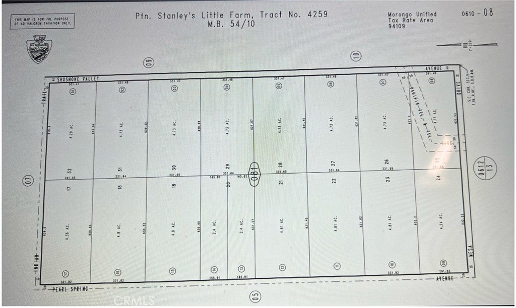 Excellent location! This property sits on a corner lot located on Indian Trail and Shoshone Valley Road, which are both paved roads with beautiful views of the mountains and the desert. The lot is flat and is very clean. What a perfect place to build your dream home. With 4.297 acres, you will also have enough land to build a couple of ADU's, storage for all your toys, even a swimming pool. Utilities are available nearby. This is an excellent investment. Give me a call, seller is ready to sell. Parcel Number: 0610081010000 Legal Description: TRACT 4259 LOT 32