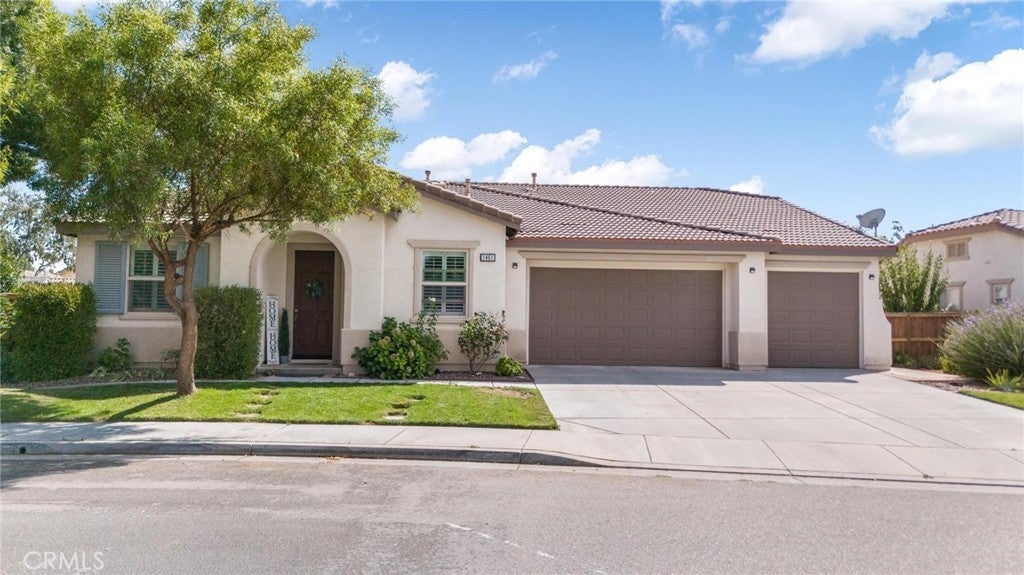 Beautifully upgraded single-story home offering 4 bedrooms, 3 bathrooms, plus an office that can easily serve as a 5th bedroom. From the moment you walk in, you’ll notice the vaulted ceilings, laminate flooring throughout, dual-pane windows, and custom shutters that bring in natural light and style. The spacious floor plan includes a large living area with sliding glass doors leading to the backyard, a kitchen with a double oven and ample storage, and a convenient indoor laundry room. The primary suite is a retreat of its own with direct patio access, a huge walk-in closet, and abundant storage. This home also features a 3-car garage with RV potential, providing plenty of parking and flexibility for toys or work vehicles. The backyard is designed for both enjoyment and function with a covered patio, two peach trees, one plum tree, and multiple citrus trees, all surrounded by colorful flowers in the front and back. Located in the desirable Sundance Community Association, this property offers a low HOA and a 1.8% tax rate, plus no solar—so no payment to absorb. A rare combination of upgrades, functionality, and outdoor charm in a well-maintained community—ready to welcome its next owner.