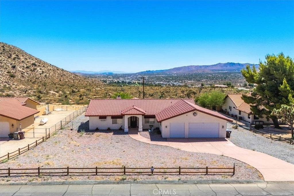 Beautiful home, beautiful views high in the hills in the very desirable country club neighborhood is this modern style gem of a home on over a half acre lot. Featuring 3 bedrooms, 2 baths and a bonus room for an office, den, studio or other. The great layout boasts a split bedroom design with a large primary bedroom with a beautiful ensuite bathroom. The primary bathroom has dual vanity sinks and a large walk in closet that has a window in it to allow for natural light. The living area is also spacious and has a great view from the near wall length windows and sliding glass door. Pull up to the exhibition kitchen counter which makes for a great entertainers spot for those who love to cook. Plenty of cabinetry in the kitchen and a lot of counter space. There are really nice tile floors in the entry, kitchen, dining area and bathrooms and the bedrooms are carpeted. The laundry area is also well equipped with plenty of counter space and storage and the 3 car garage provides ample space for your vehicles, tools or toys. It is obvious that the previous owner's pride of ownership provides for a well maintained and cared for home. You will find that the homes location is a great attribute. Being high up in the hills with no neighbors behind the home to obstruct the stretching views across the valley you can see for miles. The fully fenced back yard is a relaxing retreat with nice patios a gentle slope and private views. From this location it is not a far drive to the shops, restaurants and venues of Yucca Valley, chic Pioneertown and downtown Joshua Tree as well as only just over 20 minutes to the main entrance of the Joshua Tree National Park itself. Also just under a half hour drive to the Palm Springs area with it's great restaurants, shops, many wonderful theaters and Acrisure Arena, home to the Firebirds and some incredible concerts and shows. Entertainers delight! Come take a look and you will want to make this one your new home.