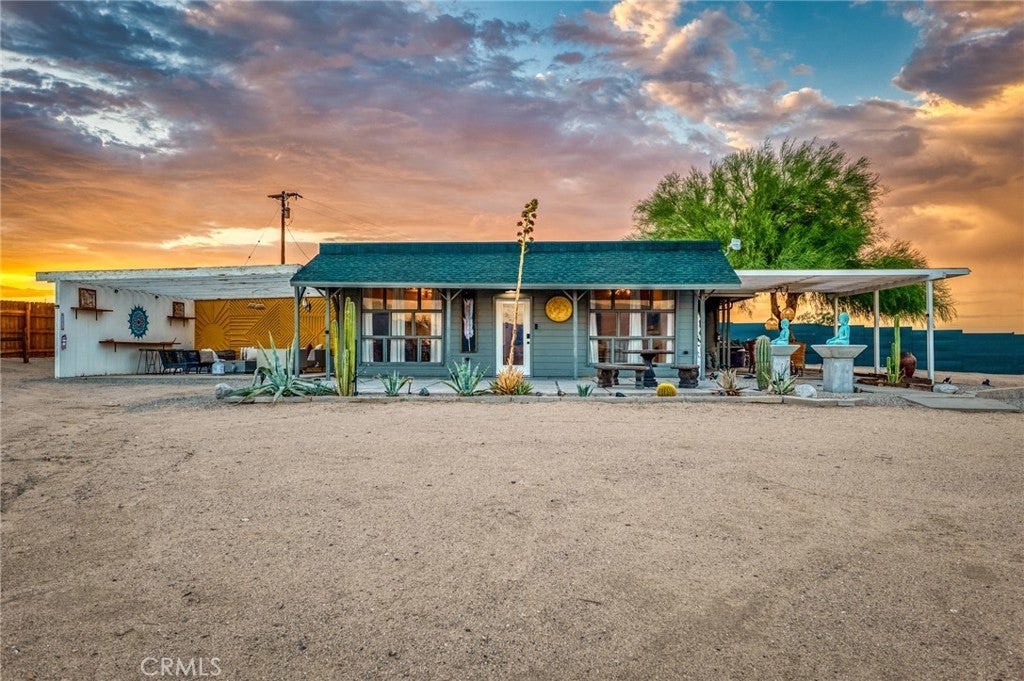 Welcome to this stylish 3-bedroom, 1-bath mid-century desert compound with 1,418 sq ft of living space and sweeping views of the Joshua Tree National Park hills. This property is fully dialed in and ready to enjoy, offering strong appeal as both a private desert getaway and an investment opportunity. The main home features an open floor plan with light-filled living spaces, two spacious bedrooms, plus a versatile third room ideal as a den, office, or extra sleeping quarters. Interiors include modern flooring, updated fixtures, a sleek kitchen, efficient mini-split systems, and a spacious walk-in shower. A detached guest studio with its own A/C and private outdoor hot/cold shower expands the possibilities, whether for hosting additional guests, creating a wellness or art space, or boosting rental income potential.