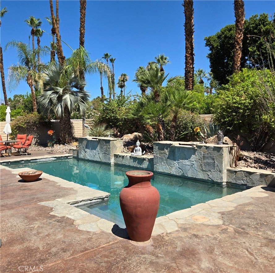 This beautiful fully furnished turnkey pool home is located in the Belmonte Estate community of Palm Desert with coded entry gate. There are 3 bedrooms each with there own bathroom, a large sized great room with dining area as well as a wet bar, fireplace and flat screen TVs in each room. The home has French doors out to beautiful backyard with pool, spa and gazebo, perfect for entertaining. The home has shutters throughout and ceiling fans, Kitchen is fully furnished with granite counters and stainless appliances and spacious eating area. Laundry room is inside near secondary bedrooms. On opposite side of house. There is a double door entry to the primary bedroom ensuite. The home is centrally located in Palm Desert across from the Marriott Hotel and Villas. If interested in a 4-6 month seasonal lease, home is available for $6000 monthly rate.