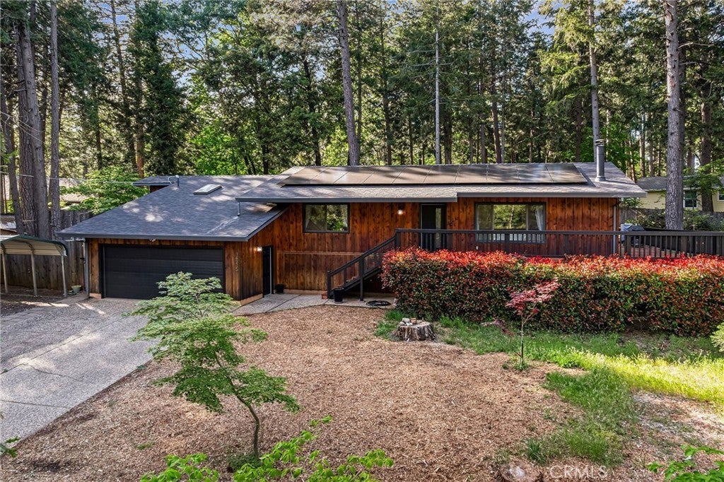 Check out this CUSTOM-BUILT home in a Fire-Wise community with a CRAZY amount of upgrades! Marvel at all of the parking space whether it's the driveway, garage, or the nice large metal carport! As you walk up to the front door, you will quickly notice the custom metalwork on the railing of the stairs. Step inside and view the real 2x6 fir wood floors! The living room features a wood burning stove (serviced and cleaned 12/2024), plantation shutters, and even a couch that is staying for the buyer! As you walk to the dining room, you will notice the newer custom door that leads to the BRAND-NEW deck, but also a nice pet door for quick access for your pets! Seller is even willing to leave the dining room table for the buyers as well! Walk into the kitchen and notice the $22,000 kitchen remodel complete with quartz counters, newer (2022) stainless steel appliances (ALL STAYING), self-closing drawers, pull-out drawers, large pantry area, and a beautiful window to gaze into the well-manicured backyard! With 4 spacious rooms, and 2 bathrooms, there is PLENTY of room for all of your needs! Sellers used one of the rooms as an art studio because of the AMAZING natural light that comes in. This home features updated lighting, NEW interior paint, NEWER HVAC (about 3 years old), NEWER Roof (about 3 years old), NEW flooring, 20 NEW SOLAR PANELS AND TESLA BACK-UP BATTERY (about 1 year old, buyer to assume solar loan), and tree work ALREADY DONE! The electric panel was replaced in 2022, and the seller even replaced the electric sub panel as well! As you walk on the NEW deck to gaze at over a half-acre of land with a full fenced backyard, you will also see the nice chicken coop that STAYS, a well-maintained storage shed, and even a fenced garden area! Even with all of this, you still have SO much land! What will you do with the concrete pad in the backyard? Perhaps put a spa there? For an extra boost of confidence, the seller has also supplied a whole home inspection and roof inspection all completed 05/2025. Pest inspection will be done in about a week! Seller is also leaving the patio umbrella, ring doorbell, approximately THREE cords of Almond wood, and grill for you! Another perk? NO HOA, but also access to amazing hiking trails! Check out this property today, it's a whole vibe!