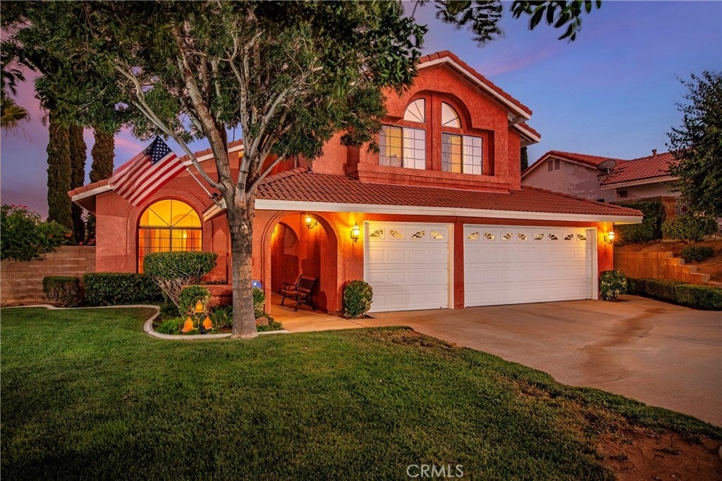 This gorgeous 3-bedroom + 2.5 bathroom house in the Rancho Vista community is situated on a peaceful cul-de-sac and is located near the renowned Rancho Vista Golf Course. A well-kept lawn, mature trees, and shrubs enhance its curb appeal. Upon entering the home, take note of the open floor plan with features of high ceilings, neutral-colored tile flooring, carpet, and ample natural light. Upgraded baseboards, crown molding, and ceiling fans add to its charm. The formal living room and dining room are spacious and inviting. The kitchen has multiple cabinets, an eat/bar countertop, stainless steel/black appliances(refrigerator included), and a window that overlooks the serene backyard. The cozy family room has a fireplace for warmth. The first floor consists of a half-bathroom and a laundry room with hanging cabinets and the washer/dryer included. The upper level has three spacious bedrooms and a full guest bathroom. The primary bedroom has a walk-in closet and a balcony with a stunning peek-a-boo view of the city. The primary bathroom has two vanity sinks, an extra closet, and a tub/shower enclosure. Step out back and enjoy your private paradise. The oversized patio cover is perfect for entertaining. The details of the planter walls and concrete walkways, the manicured lawns and shrubs make the house even more charming. Elementary schools and a middle school are within walking distance, as well as restaurants, shopping, Marie Kerr Park, and the Palmdale amphitheater. Make this move-in ready home yours!