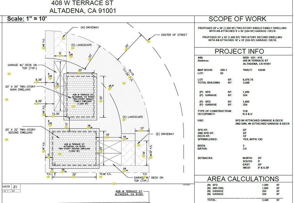 Unique opportunity in Altadena! This property sits on a spacious lot where the original home was lost in recent fires. The parcel comes with an approved plot map / site plan and drafted architectural plans for two new single-family residences. Buyer can take advantage of existing construction loan, architect and contractor to realize their dreams Phase 1 and Phase 2 completed by Army Corp of Engineers * Proposed Home #1: 1,200 sq. ft. two-story dwelling (20’ x 30’) with attached 324 sq. ft. garage/deck (9’ x 36’). * Proposed Home #2: 1,600 sq. ft. two-story dwelling (25’ x 32’) with attached 324 sq. ft. garage/deck (18’ x 18’). Plans are in progress and awaiting final approval. Buyer can continue with current designs or bring their own vision. Highlights: * Rare chance to build two new homes in a sought-after Altadena neighborhood. * Approved site plan = head start on development. * Potential for multi-generational living, investment, or resale. * Convenient access to Pasadena, hiking trails, and the San Gabriel Mountains. This property is perfect for a developer, investor, or end-user looking to create brand-new residences in one of Altadena’s most desirable communities.
