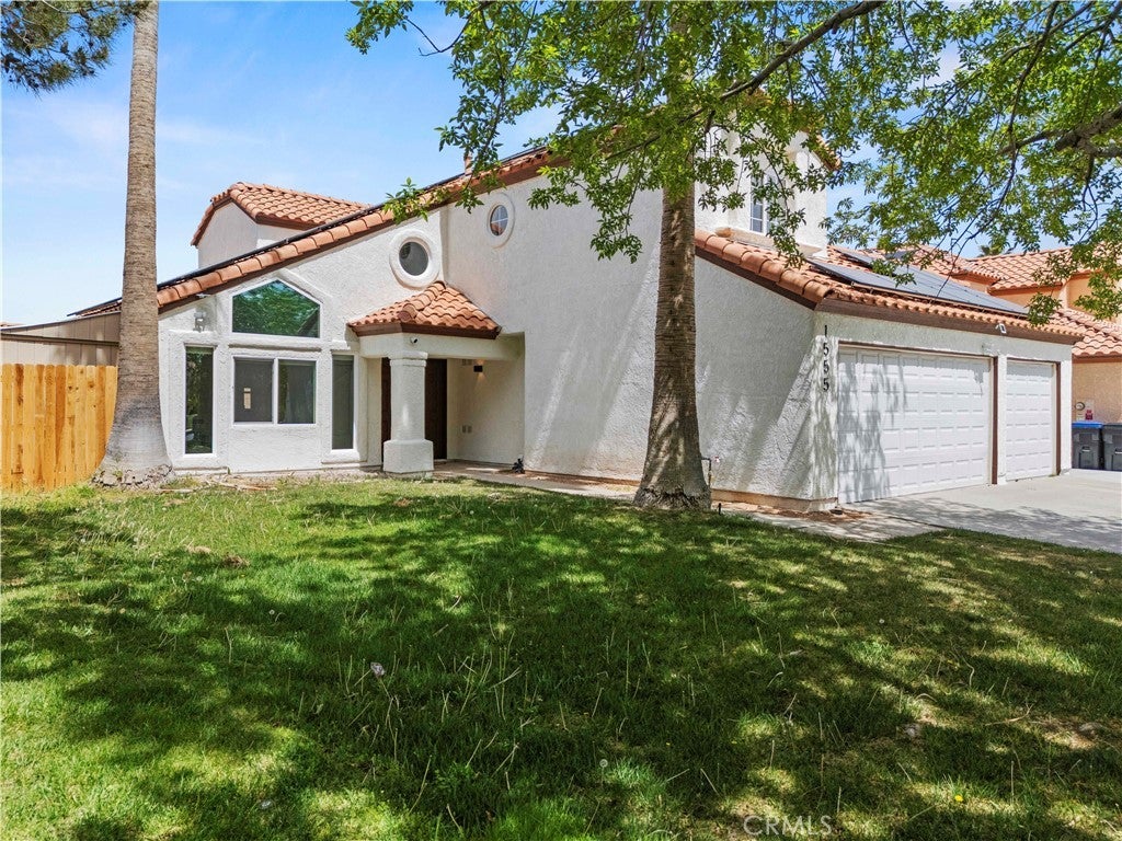 Welcome to this beautiful two-story home that effortlessly blends comfort, style, and functionality. Step inside to discover a spacious layout featuring a convenient downstairs bedroom and full bathroom, perfect for guests or multi-generational living. Upgraded laminate flooring flows seamlessly throughout the home, complemented by an abundance of natural light from the south-facing front, creating a warm and inviting atmosphere. The kitchen is a chef’s delight, boasting modern cabinetry and exquisite quartz countertops that provide both durability and elegance. Upstairs, the primary suite is generously sized and includes a walk-in closet and a spa-like en-suite bathroom with upgraded tile and a double sink vanity. The house originally had five-bedrooms, but the previous owner combined two bedrooms into one expansive room, offering a flexible layout. The additional bedrooms are comfortably sized and full of potential. Step outside to a low-maintenance spacious backyard, perfect for eco-conscious living. Enjoy privacy and security with block walls and take advantage of the custom RV access and gate—ideal for recreational vehicles or extra storage needs. Large backyard storage units provide even more flexibility for the personal items. Located just minutes from the Antelope Valley Mall, local schools, and shopping centers, this home offers both convenience and quality living. Don’t miss your chance to make this versatile and beautifully maintained property your own!