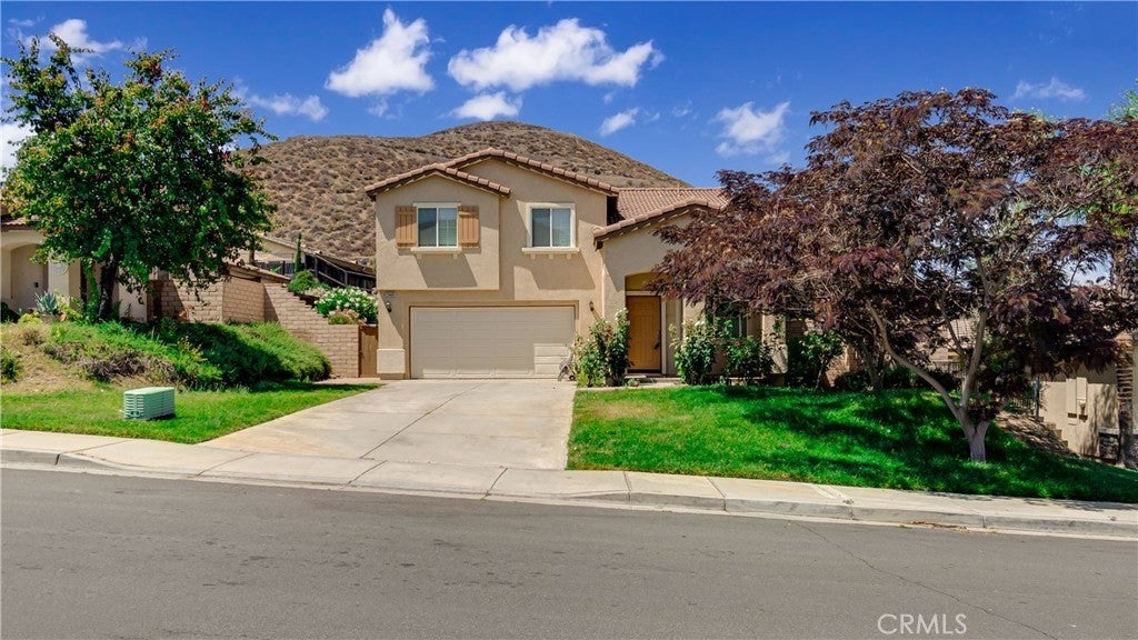 Welcome to this 2 story home in Menifee, featuring 4 bedrooms, 3 bathrooms, and a generous 2233 sqft of living space. With a large 7841 sqft lot, this property offers beautiful curb appeal, thoughtfully landscaped and a 2 car garage. Enter through the front door to discover a warm and welcoming living space, you will be greeted by tile flooring that flows seamlessly through the home. The sitting room and dining room boasting high ceilings, recessed lighting and multiple windows filling the area with natural light. Straight ahead, a welcoming staircase sets the tone for this layout. You will find a convenient downstairs bedroom and a full bathroom complete with a single-sink vanity and shower/tub combo. Beyond that, a spacious living room and kitchen create the perfect setting for everyday comfort. The kitchen, featuring a stunning color scheme, a kitchen island with bar seating and ample storage. This kitchen boasts granite countertops and dark colored cabinets, complemented by a stylish backsplash and recessed lighting. Enjoy stainless steel appliances, including a double oven, cooktop, and dishwasher. The kitchen seamlessly opens to the dining room, with a sliding glass door to enjoy indoor-outdoor living space to the backyard. The living room is a bright space, featuring a ceiling fan and a window that floods the room with natural light. Cozy up to the wood-burning fireplace, and enjoy the convenience of a media nook. Upstairs, you will find plush carpet floors throughout, ceiling fans in every room and a loft area with recessed lighting and plenty of natural light through the windows, perfect for activities. The 2 additional bedrooms provide comfort, each featuring windows and sliding door closets. The spacious master bedroom features plush carpet flooring and a window for natural light. The master bathroom offers a walk-in closet, a soaking tub, and a walk-in shower. Dual sinks with plenty of cabinet space provide comfort and everyday convenience. The hallway bathroom offers a dual sink vanity with plenty of storage, laminate floors, and a shower/tub combo. A convenient laundry room completes the upstairs, featuring shelf space and laminate floors. Explore a backyard complete with a covered patio, perfect for relaxing or hosting outdoor gatherings. The space is beautifully landscaped with bark, a retaining wall lined with vibrant greenery, and mature trees that create a tranquil, private setting.