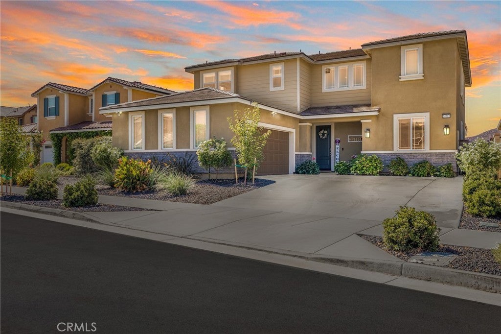 When it comes to modern living this is the one! With upgrades galore, 6 bedrooms, 4 bathrooms, OWNED solar, and an above ground spa, this home literally has it all! The 2021 built Richmond American home features white and black finishes, on a cul-de-sac and is located in the highly desirable community of Audie Murphy Ranch in Menifee, within feet of the new Kathryn Newport middle school. The front curb appeal offers drought tolerant landscaping, and a cozy porch with stunning mountain views. Inside the home you are greeted by soaring 30 foot ceilings, LVP floors and a desirable floor-plan offering 2 main floor bedrooms. The first bedroom is appointed with upgraded carpet, a black wood accent wall and offers a full bathroom boasting a single vanity, and shower-tub combo. Across the hall is a large, long room that offers three built-in desk spaces and custom built-in cabinets, which is perfect for an office or flex space! The two car garage offers EV charging capability and the whole house filtration system and water softener. The large Great Room offers the most beautiful custom electric fireplace in a black shiplap inset surrounded by custom cabinets. The dining area is large enough for a huge farm table and flows into the chefs kitchen. This space is appointed with granite counters, an eat-up island, honeycomb backsplash, black pendant lighting, stainless steel appliances including a new dishwasher, double oven, 5 burner stove, RO water filtration system, and walk-in pantry. The grand staircase features a custom black chandelier, wood accent wall and upgraded carpet. The second story boasts a whole house fan, 3 large secondary bedrooms with one offering a walk-in closet and the other room acts as a junior suite with it's own full attached bath. The others share a full secondary bath. The large laundry room boasts a built-in folding table and storage. The Primary suite is appointed with a custom electric fireplace surrounded by shiplap and a floating mantel, a wood accent wall and beautiful barn door that leads into the primary bath featuring quartz counters, a quartz lined shower and tub and a large walk-in closet. The romantic yard is appointed with a large aluma wood patio cover with recessed lighting and ceiling fans, concrete for entertaining, artificial turf, many different fruit trees, a rose garden and secret garden oasis. The community offers a club house, pools, spa, skate park, trails, sports parks and the award winning Taawila ES.